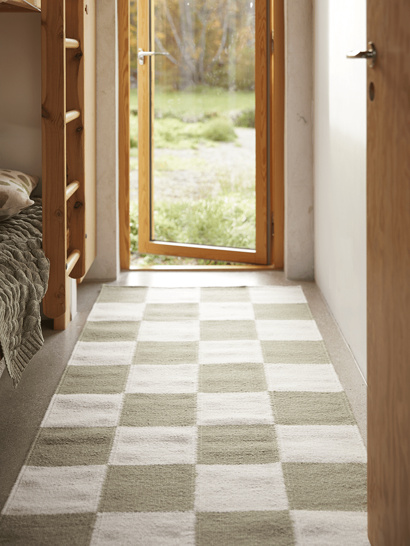 Upptäck tidlös elegans med vår handvävda gångmatta Square. Det klassiska rutmönstret i grönt och vitt ger en fräsch och stilfull touch till ditt hem. Square-mattan är tillverkad av ull, vilket gör den perfekt för kök och hall. Skapa en tidlös atmosfär i ditt hem med Squares-ullmattan och njut av både stil och kvalitet.