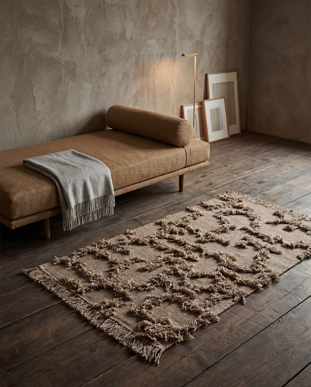 Gångmatta med dekorativ fransstruktur och jordnära ton