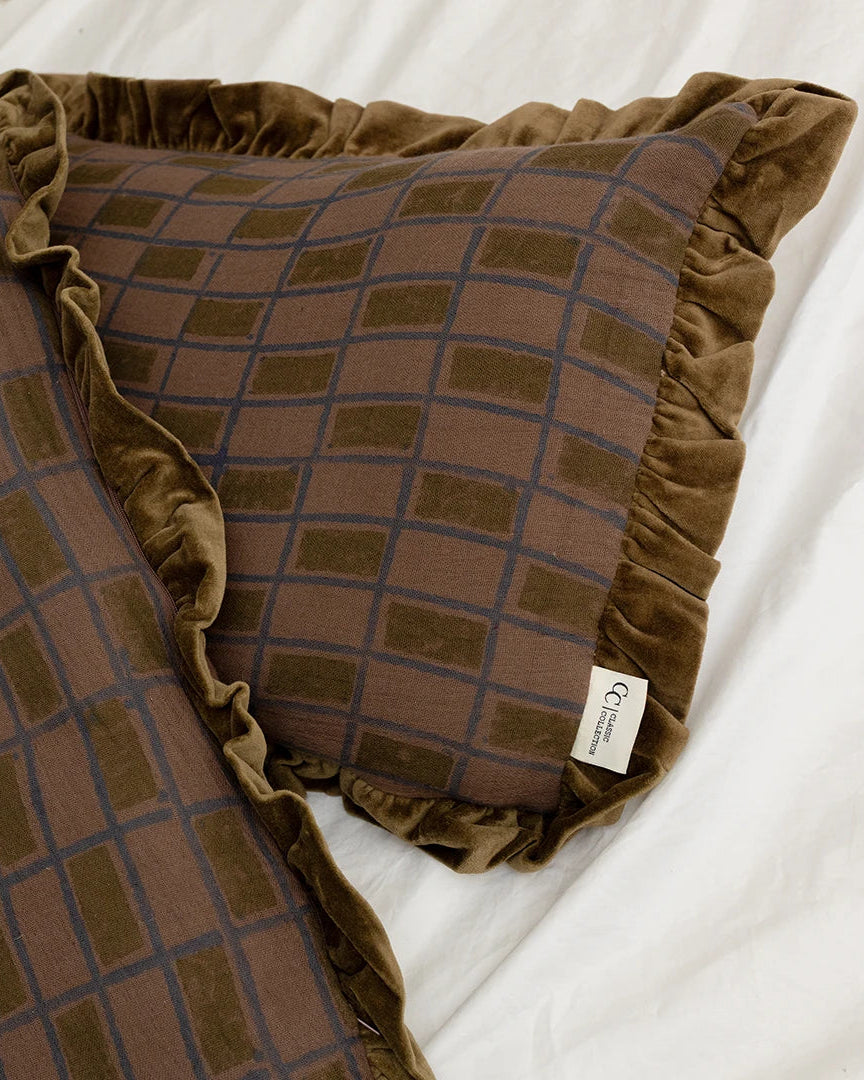 Kuddfodral Block i färgen Aubergine är tillverkat i bomull med ett grafiskt rutmönster i blockprint. Kuddfodralet ramas in av en volangkant i bomullssammet som ger ett mjukt och elegant uttryck. Med sin storlek 40x60 cm är det ett dekorativt inslag i både soffa och säng.