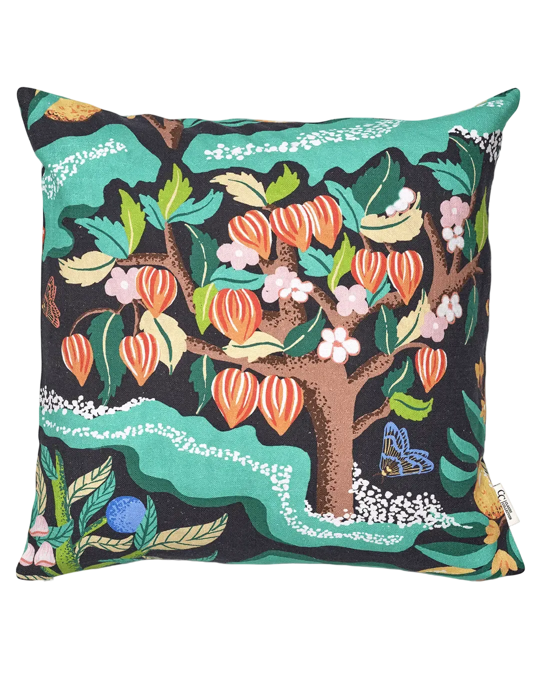 Motivet föreställer en frodig botanisk trädgård med körsbärsträd i full blom, omgiven av färgglada löv och blommor. Designen är inspirerad av naturen, med detaljerade illustrationer som ger en känsla av handmålad konst. Kudden har tryck på båda sidor, tillverkad av bomull med linnekänsla och slub-struktur.