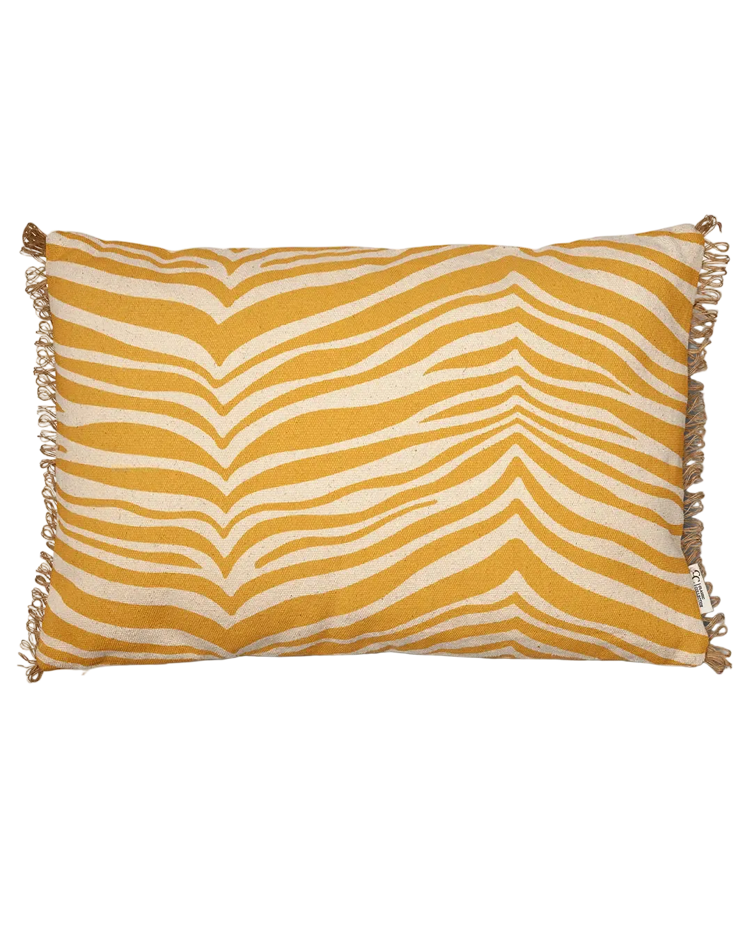 Kudde Zebra Gul, en klassisk zebramönstrad kudde i bomull. Zebrakudden har en dekorativ franskant i jute. Kudden är tillverkad i 100% bomull och mönstret är handtryckt på kudden. Kudden har en kant av jute och enfärgad baksida.