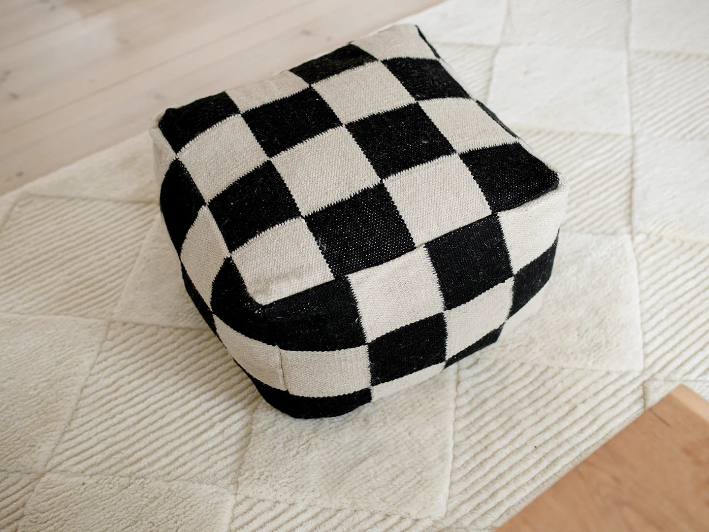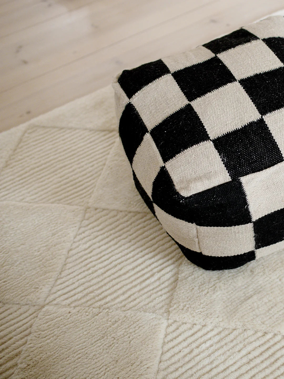 Puff Square är en stilren sittpuff som sys för hand av en slätvävd ullmatta i ett luftigt rutmönster i svart och naturbeige. Det klassiska mönstret bidrar med ett fräscht, skandinaviskt uttryck som smälter in i både moderna och klassiska interiörer. Den kubiska formen gör puffen lika praktisk som extra sittplats, fotpall eller dekorativ accent i vardagsrum, hall och sovrum.