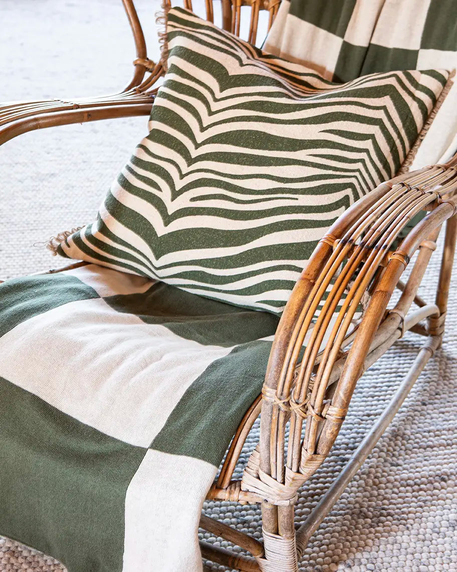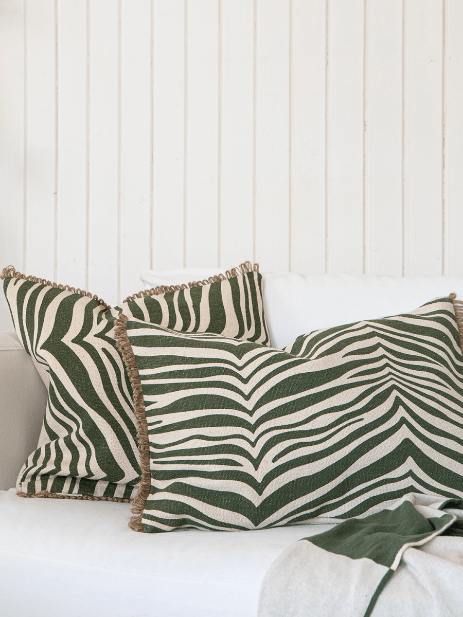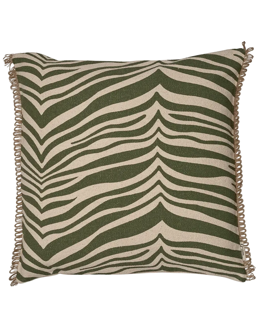 Kudde Zebra Grön – en klassisk kudde i handtryckt zebramönster på 100% bomull. Kudden har en dekorativ franskant i jute, enfärgad baksida och ett diskret blixtlås i sidan.