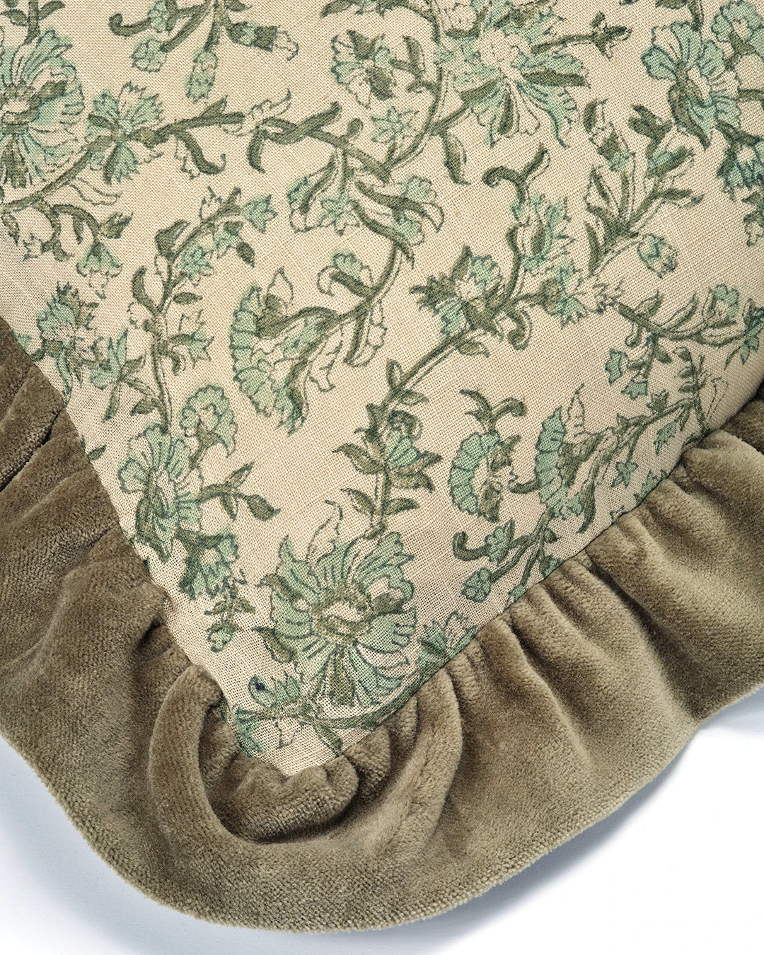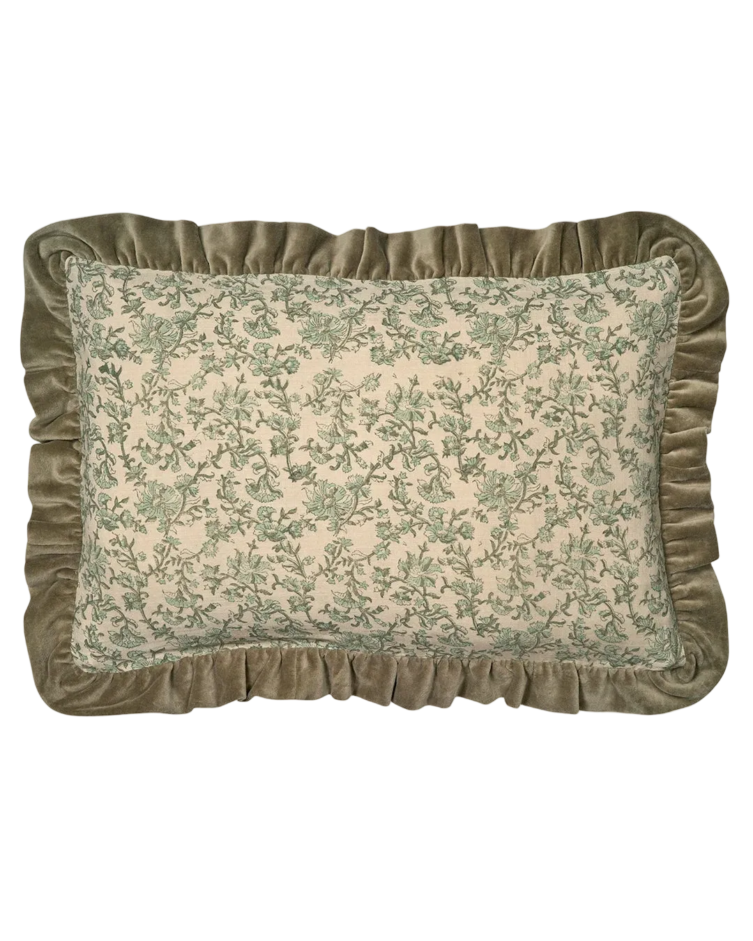 Kissenbezug Tendril in Grün, 40x60 cm. Gefertigt aus Baumwolle mit traditionellem Blockprint, wodurch jedes Stück ein individuelles Aussehen erhält. Der Rand aus weichem Baumwollsamt setzt einen feinen Kontrast zwischen Struktur und Glanz. Ideal als dekoratives Kissen auf Sofa oder Bett.