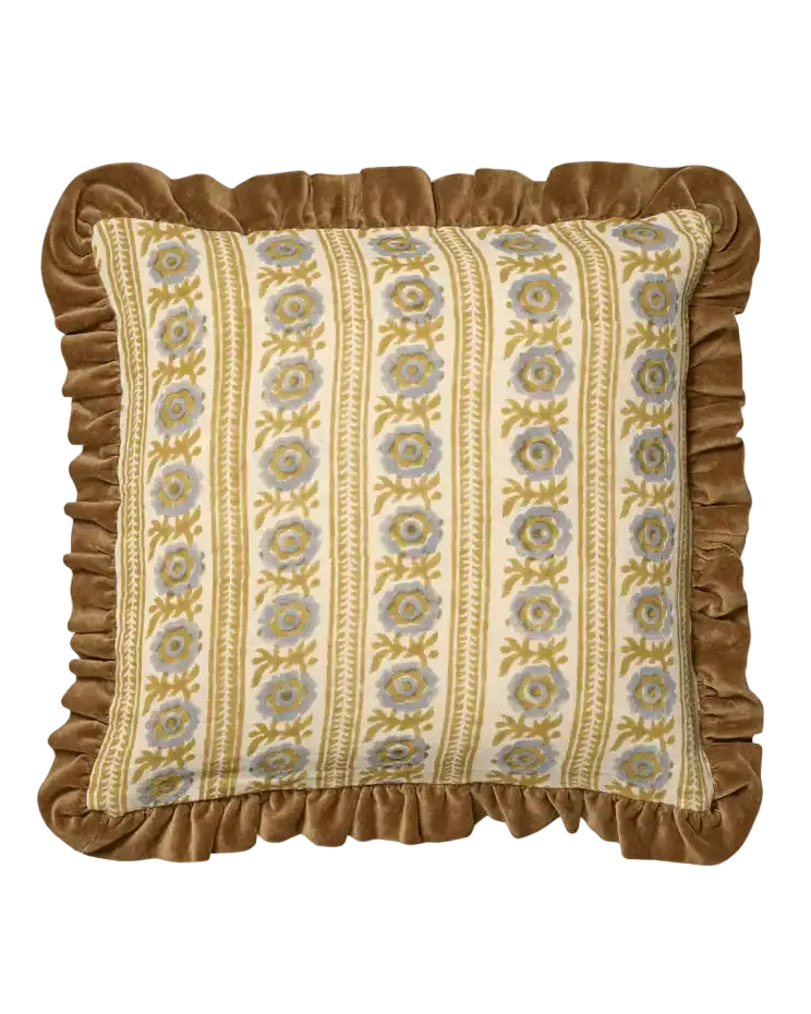 Kuddfodral Posy i färgen Gul är tillverkat i bomull med ett dekorativt blommönster i blockprint. Fodralet ramas in av en volangkant i bomullssammet som ger en mjuk inramning och en elegant karaktär. Med sin storlek 50x50 cm passar det lika bra i soffan som i sängen.