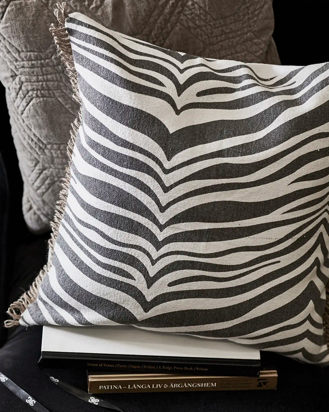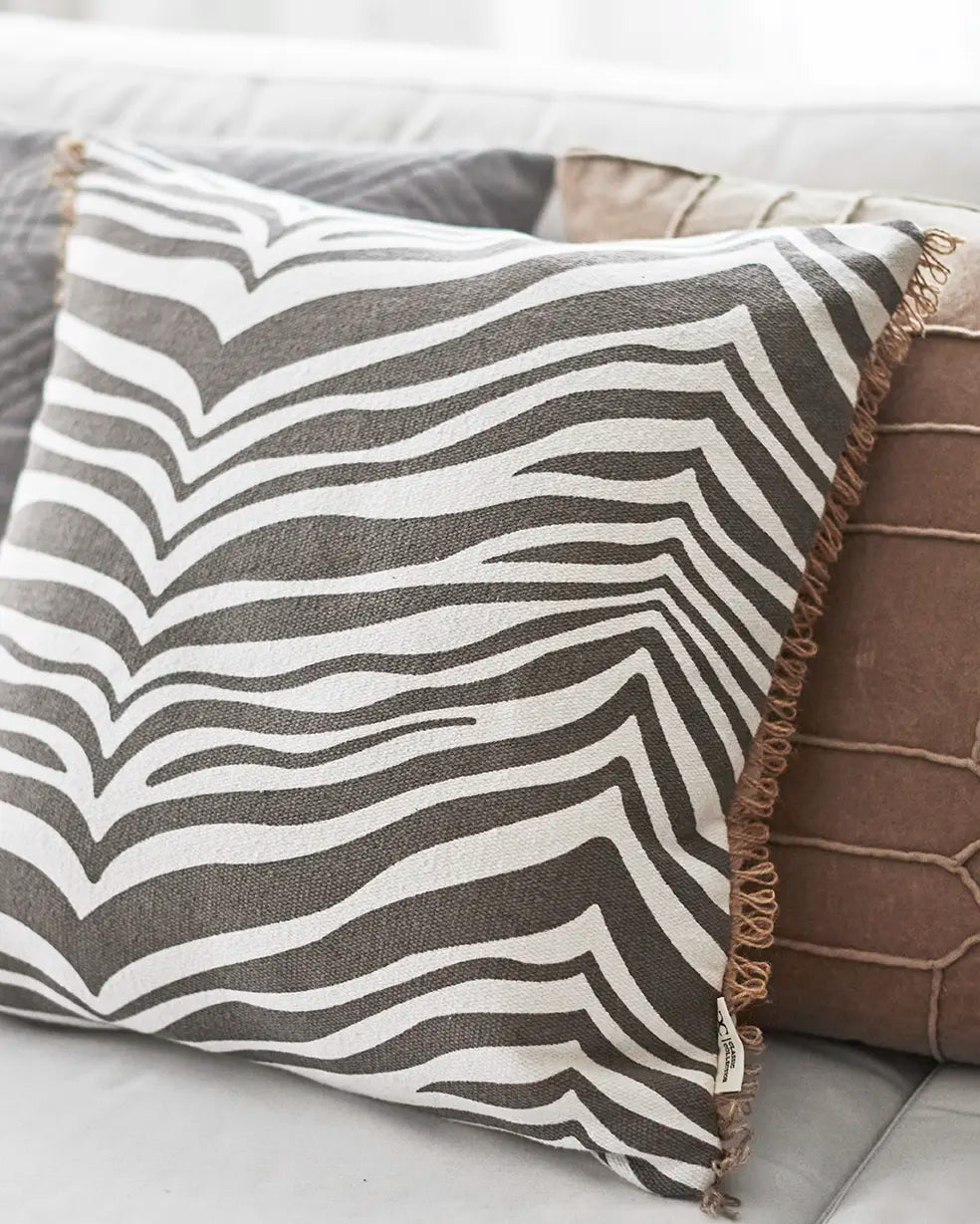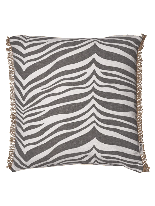 Kudde Zebra Titanium, en klassisk zebramönstrad kudde i bomull. Zebrakudden har en dekorativ franskant i jute. Kudden är tillverkad i 100% bomull och mönstret är handtryckt på kudden. Kudden har en kant av jute, enfärgad baksida och blixtlås i sidan. Fyllning ingår.