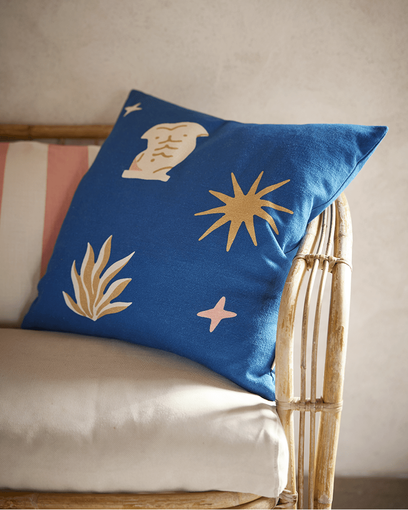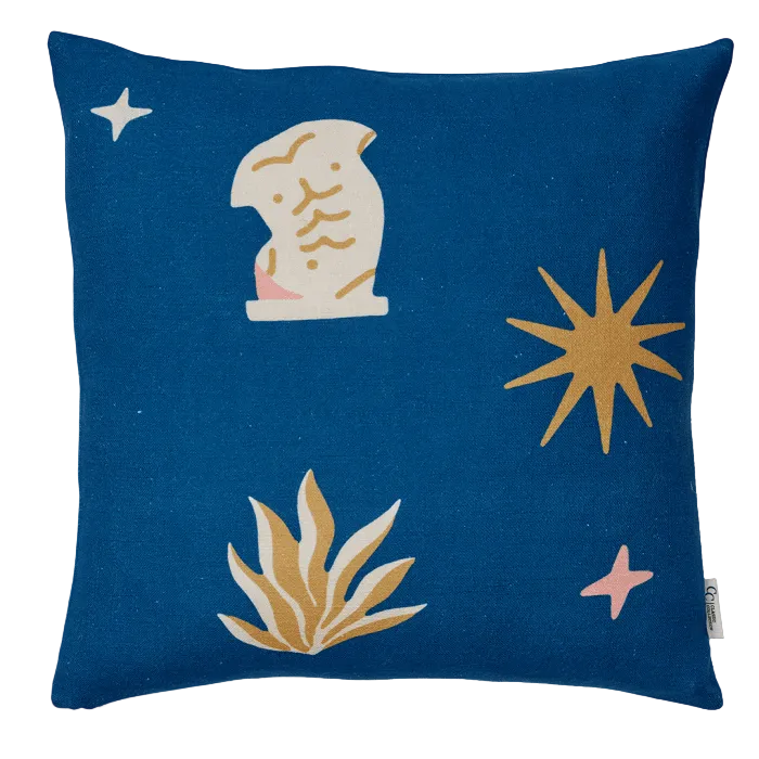 Lägg till en lekfull touch i ditt hem med vårt bomullskuddfodral Torso i storleken 50x50 cm. Det här kuddfodralet har en härlig blå botten, mönstret är lekfullt och inkluderar motiv som byst, sol och stjärnor. Detta kuddfodral är tillverkat av högkvalitativ bomull, vilket ger en mjuk och bekväm känsla.