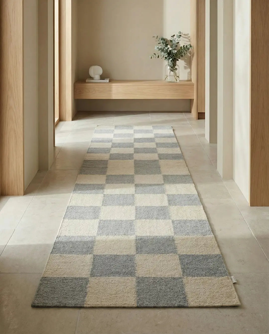 Entdecken Sie zeitlose Eleganz mit unserem handgewebten Läufer Square. Das klassische Karomuster in Grau und Beige verleiht Ihrem Zuhause einen frischen und stilvollen Touch. Der Square-Teppich besteht aus Wolle, was ihn perfekt für Küche und Flur macht.