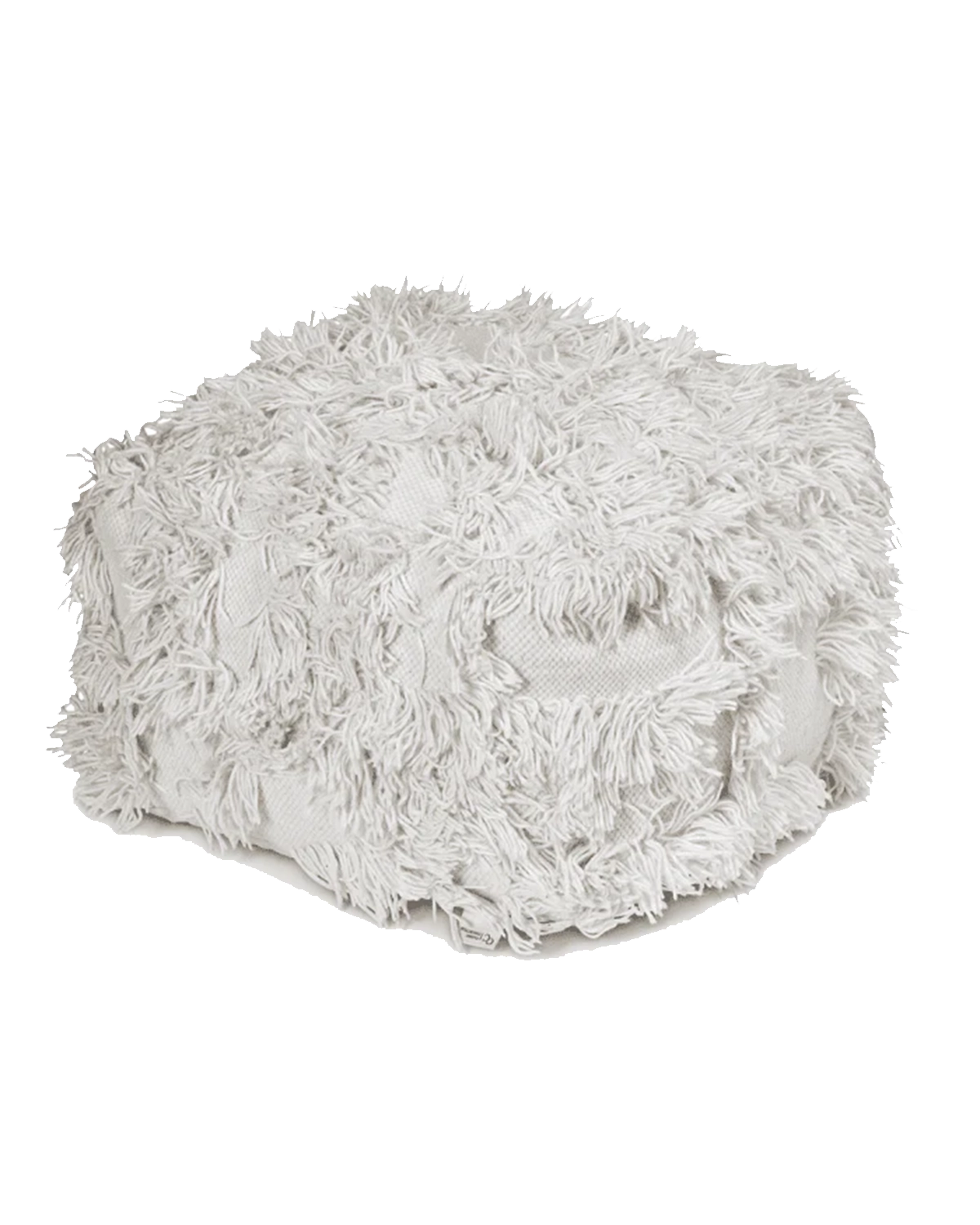 Rio är en naturligt vit, fluffig sittpuff, gjord av en handvävd matta i ull. Det oregelbundna, taktila mönstret ger puffen ett härligt liv och gör den till en stilfull detalj som passar lika bra i vardagsrummet som i hallen. Puffen fungerar utmärkt som en extra sittplats eller som en bekväm fotpall till soffa eller fåtölj.
