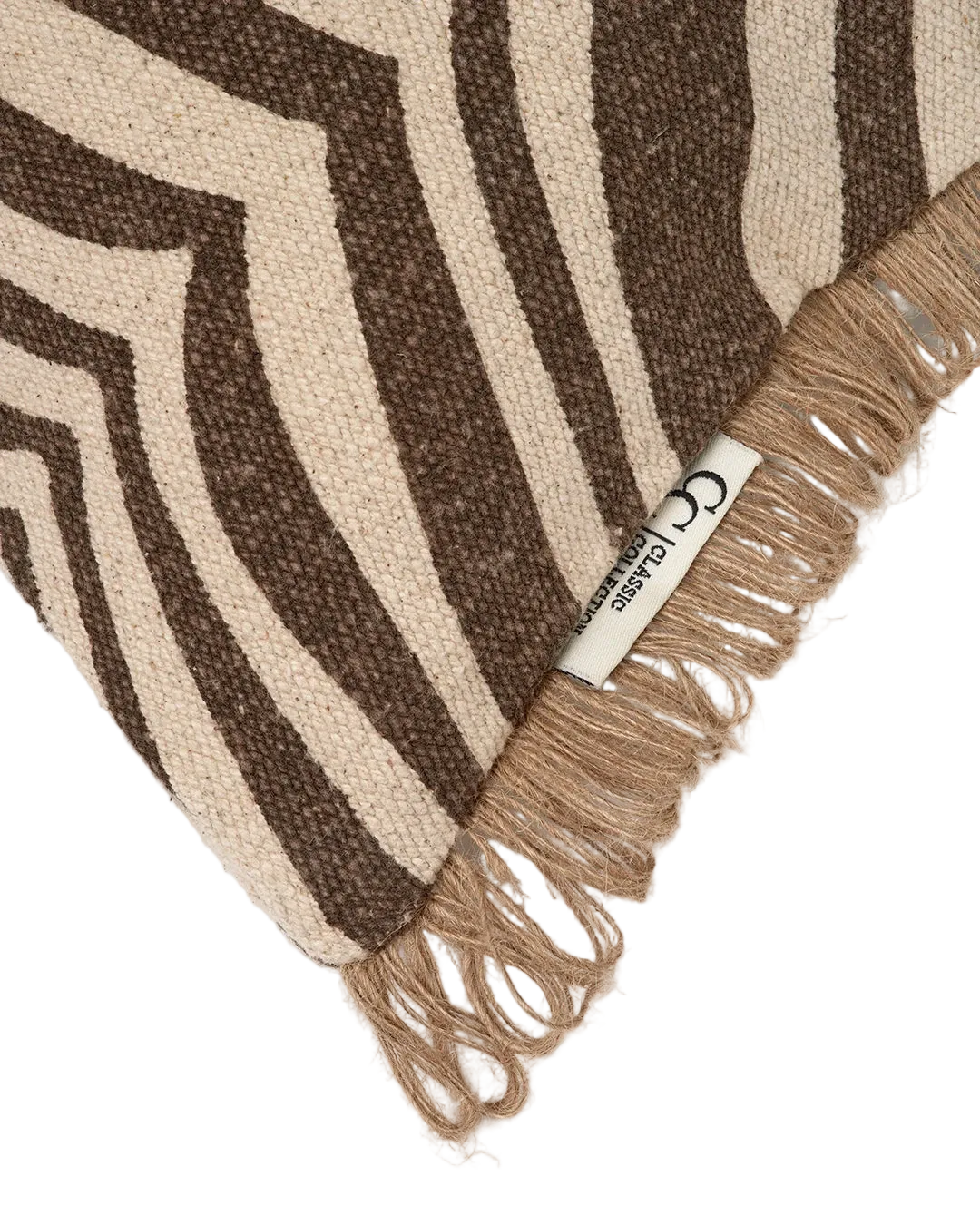 Das Kissen Zebra Braun ist ein elegantes Kissen mit Zebramuster und braunem Druck auf Baumwolle, verziert mit einer Fransenkante aus Jute. Es besteht aus 100 % Baumwolle mit handgedrucktem Muster und hat eine einfarbige Rückseite.