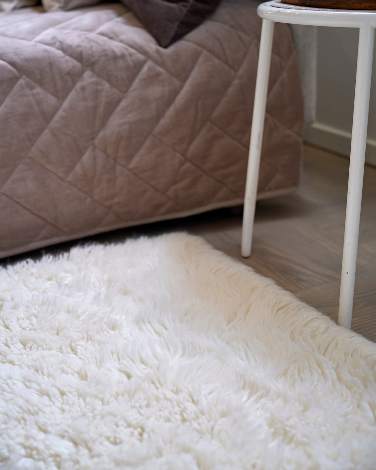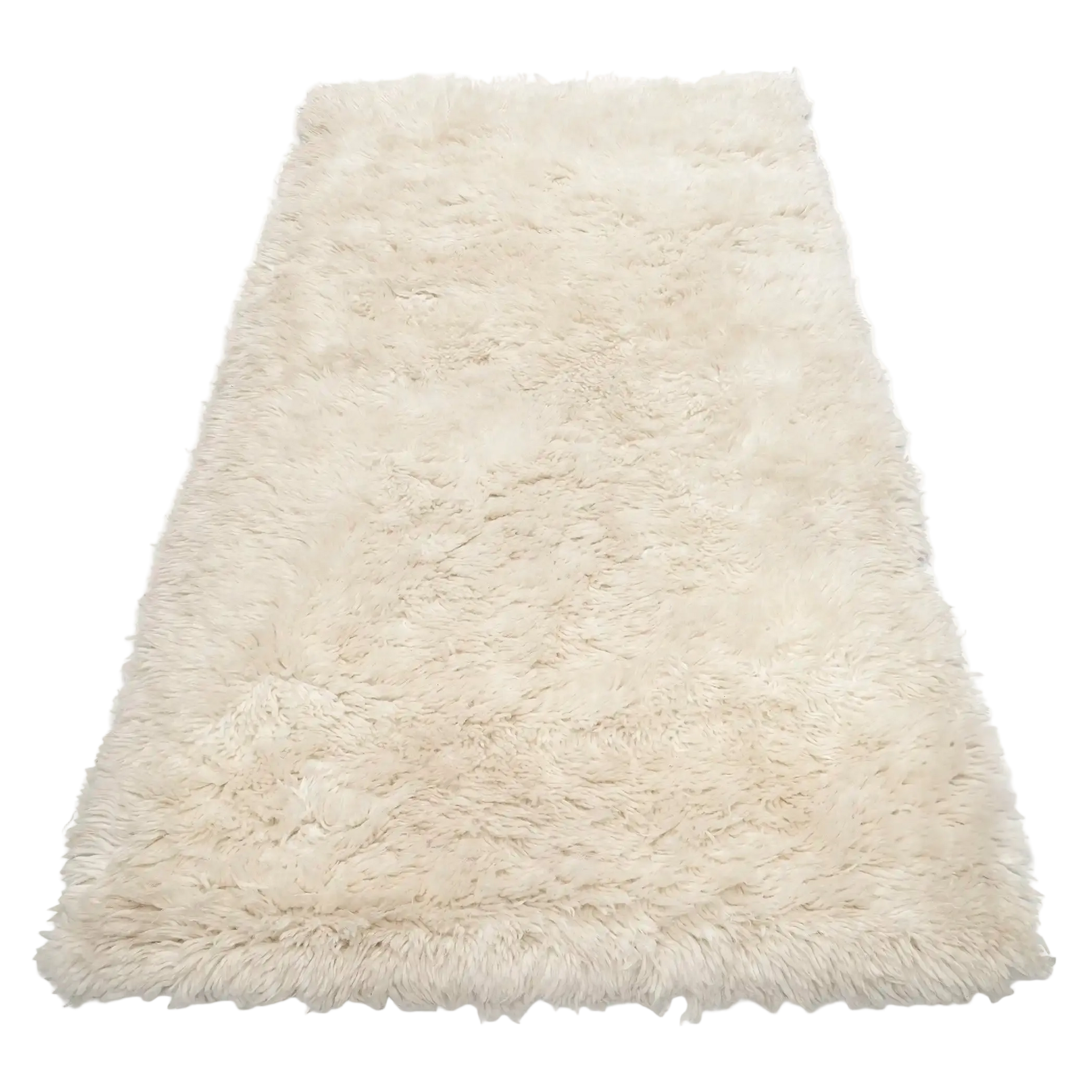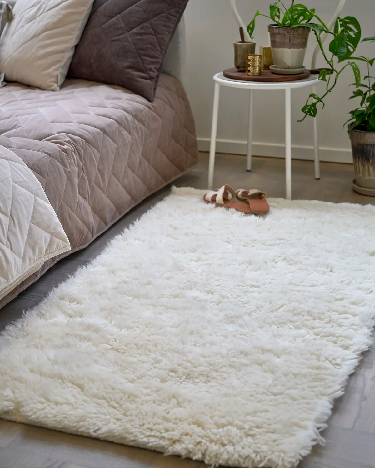 Vit fluffig ullmatta med lång lugg i Flokati-stil