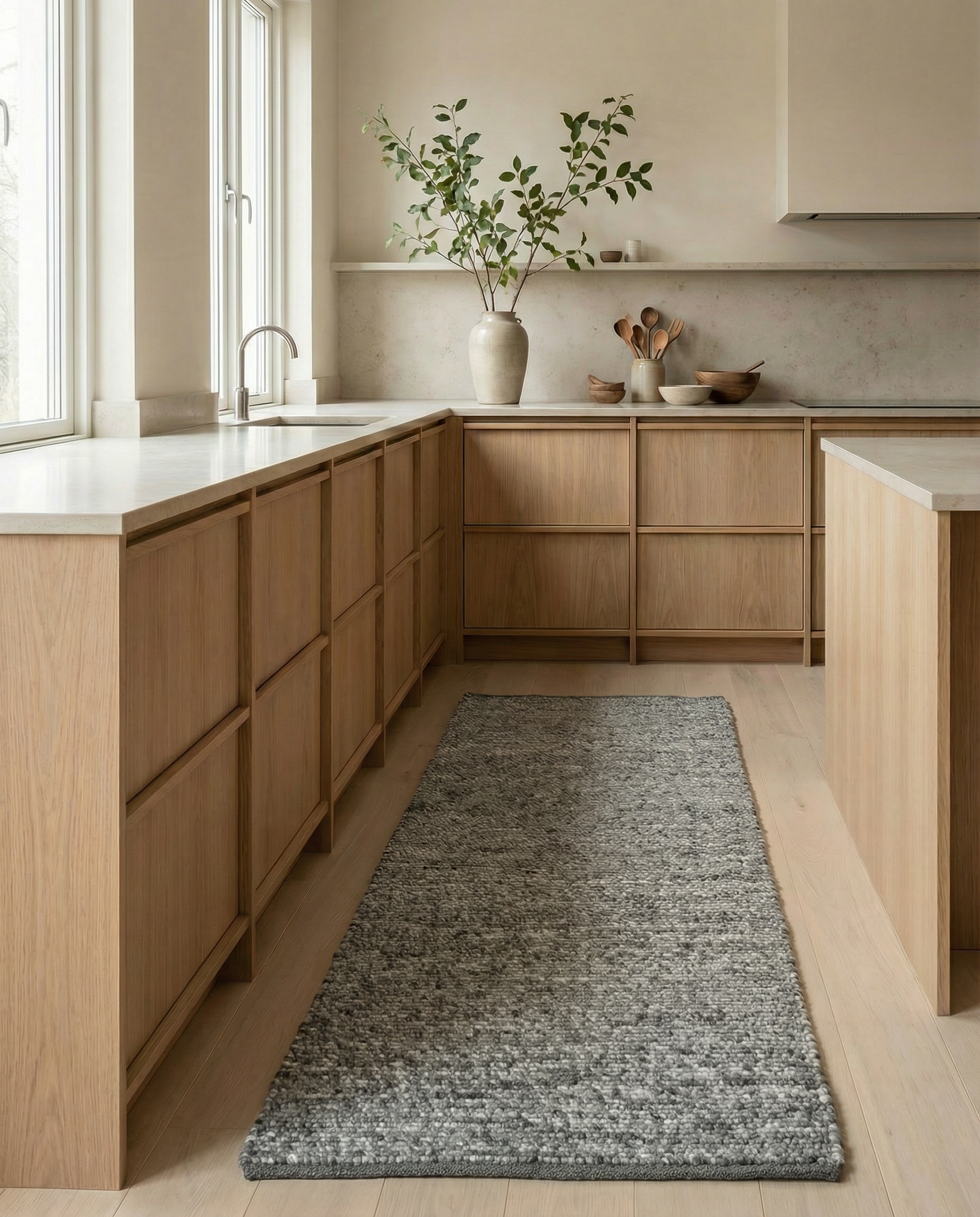 Der Merino-Läufer ist ein handgewebter Wollteppich mit einer weichen und angenehmen Textur, die an Merinowolle erinnert. Er besteht aus einer sorgfältig abgestimmten Mischung aus 85 % neuseeländischer Wolle und 15 % europäischer Wolle, was ihm eine natürliche Widerstandsfähigkeit und schmutzabweisende Oberfläche verleiht.