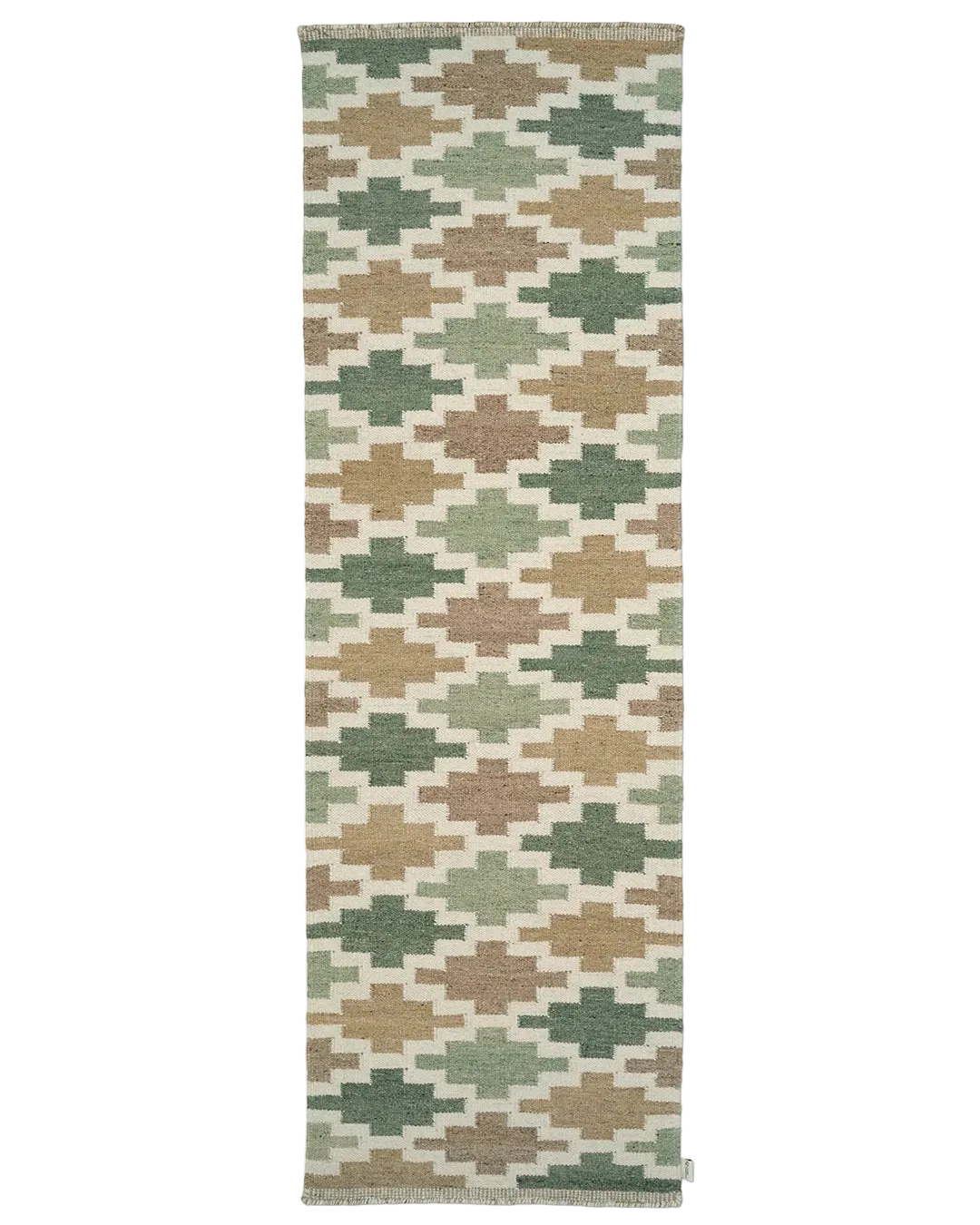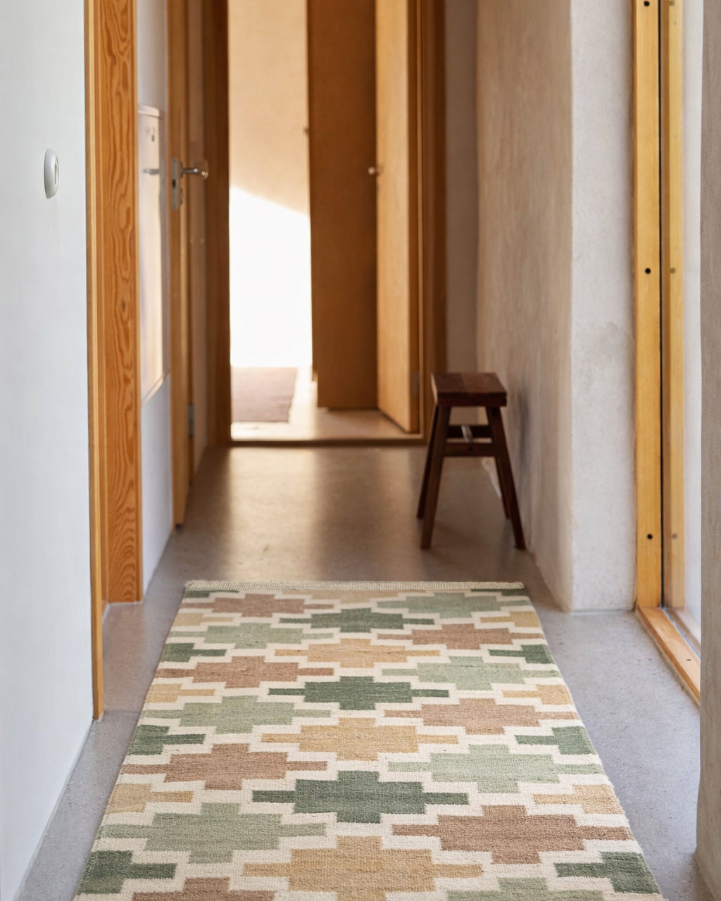 Korsnäs is a handwoven runner in the size 80x250 cm, designed to create a cohesive feel in elongated spaces such as hallways and kitchens. The colour palette in green, beige, natural and sand tones contributes to a harmonious expression that suits both modern homes and more classic interiors.
