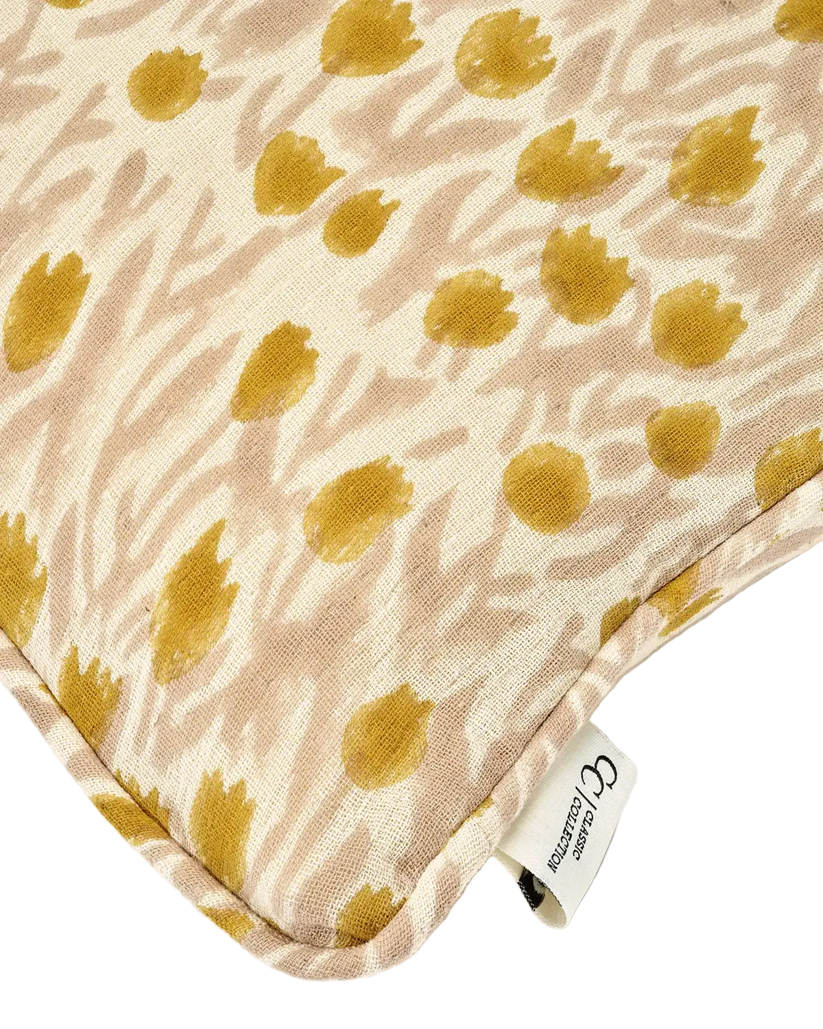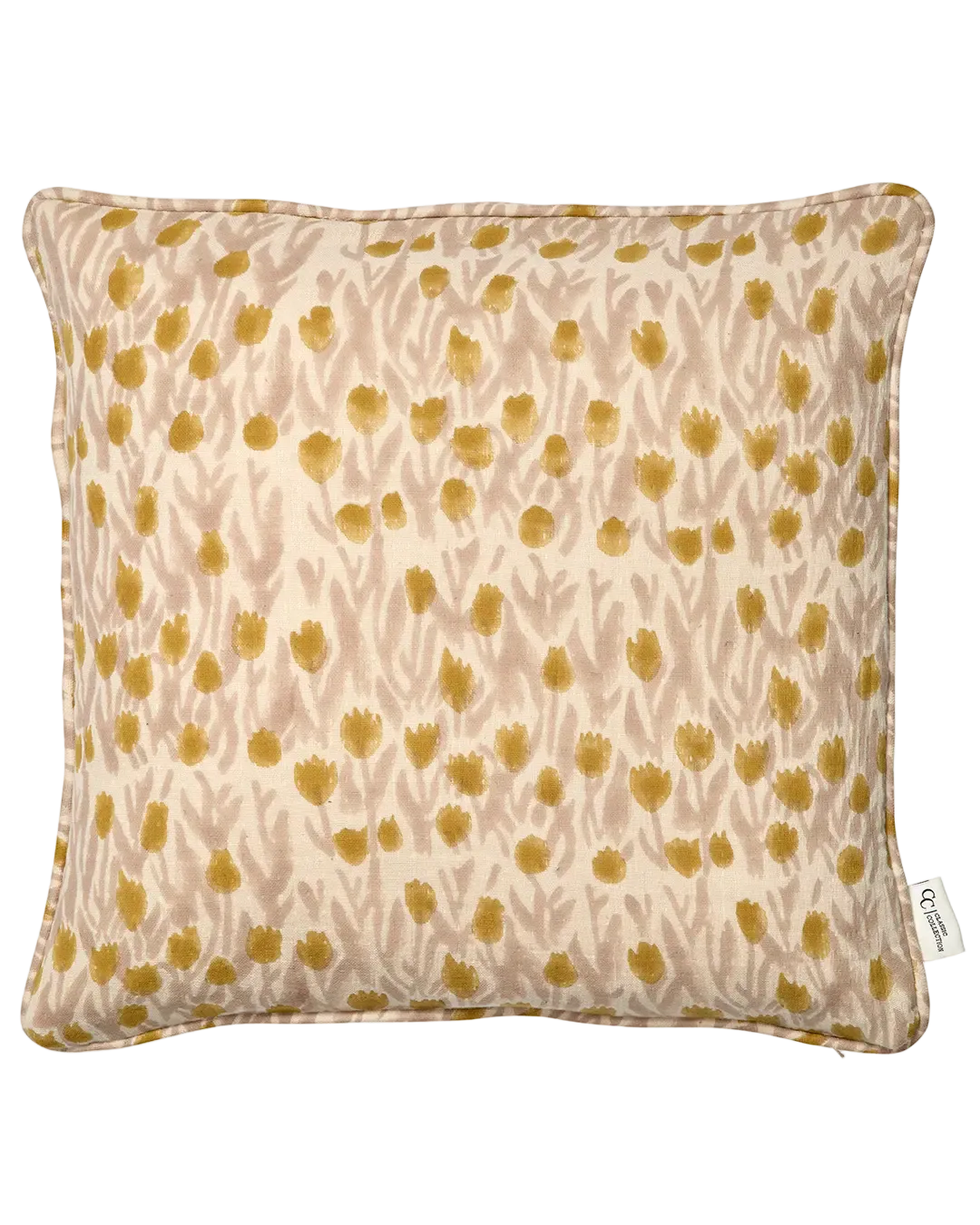 Kuddfodral Tulip i färgen Gul är tillverkat i bomull med ett livfullt mönster i blockprint. Kuddfodralet ramas in av en dekorativ passpoal som ger en stilren inramning. Storleken 50x50 cm gör det till ett enkelt sätt att skapa variation i soffan eller på sängen.
