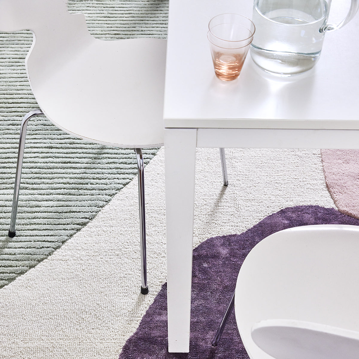 Matta Topas Ivory Green är handtuftad i Ull/Viskos och finns i flera storlekar. Mattans vita botten och det gröna, rosa och brua partiet är av ull. Det gröna partiet är klippt i ett randigt mönster. Partiet i lila är av viskos. Viskosen är glansig och reflekterar ljus. Kontrasten mellan matt ull och glansig mjuk viskos ger en vacker matta med djup.