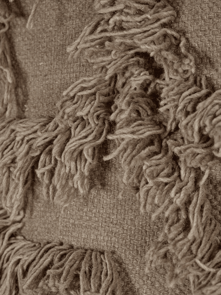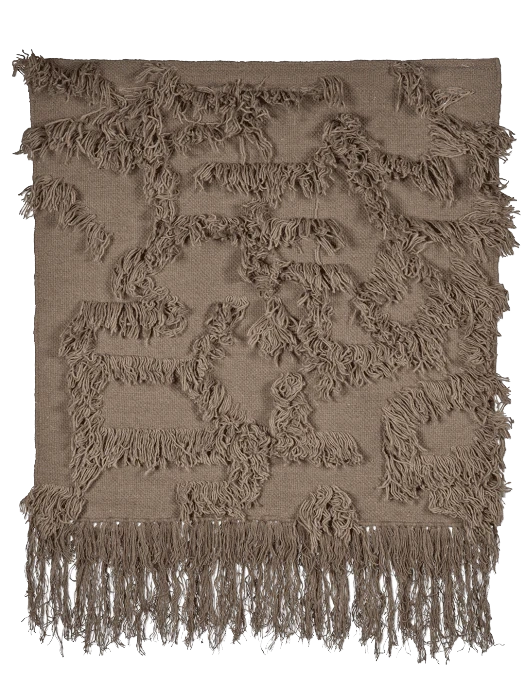 Rio väggbonad i färgen Cappuccino är en handgjord textil väggbonad tillverkad i ull och bomull. Designen präglas av en relief-liknande struktur med fransar som bildar ett livfullt mönster mot den vävda botten. Den varma cappuccinonyansen framhäver materialets naturliga känsla och ger rummet en jordnära karaktär.