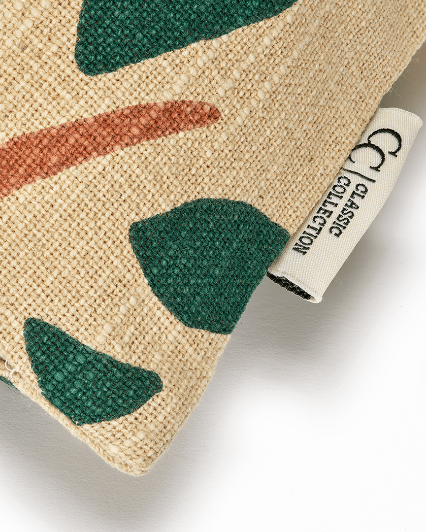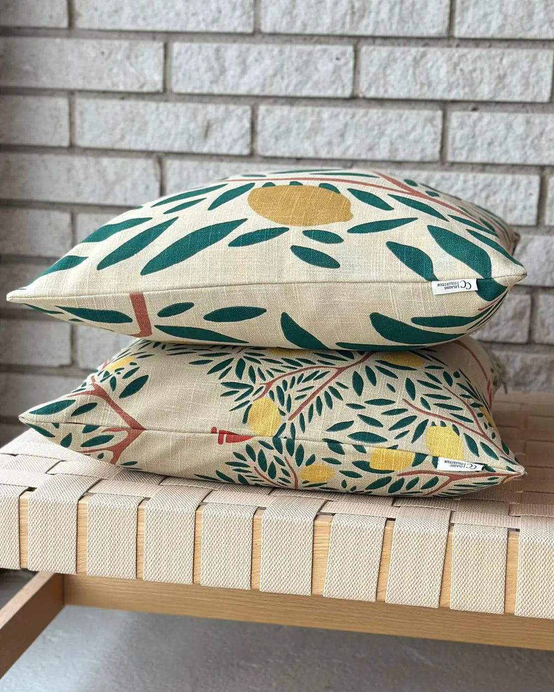 Kuddfodralet Sunny Citrus Mörkgrön bjuder på ett stiliserat citrusmotiv i gult och mörkgrönt mot en varm, naturfärgad botten. De grafiska formerna av blad, grenar och citroner skapar en lekfull och samtidigt balanserad komposition.