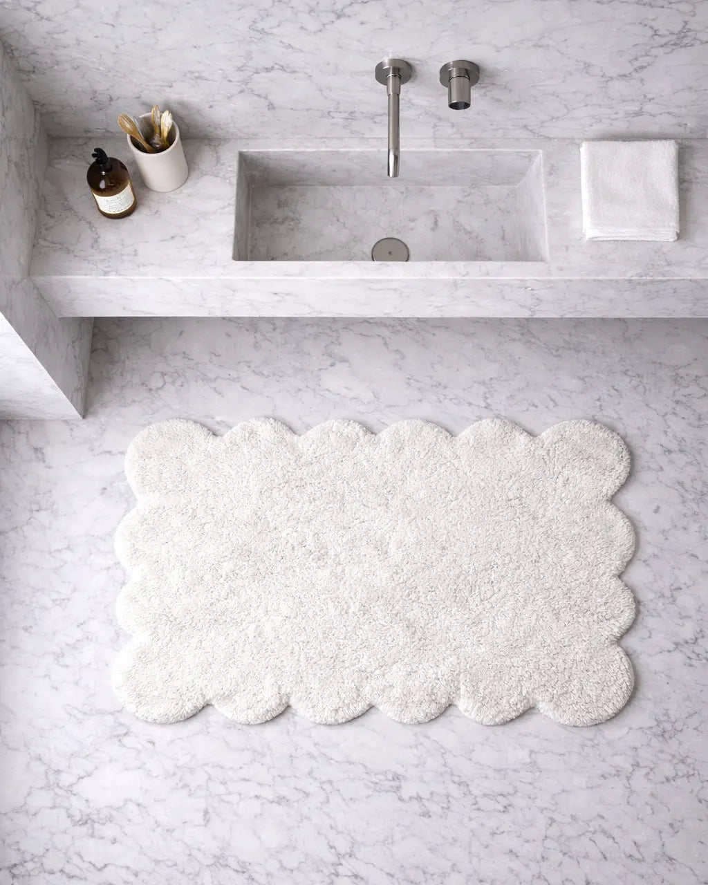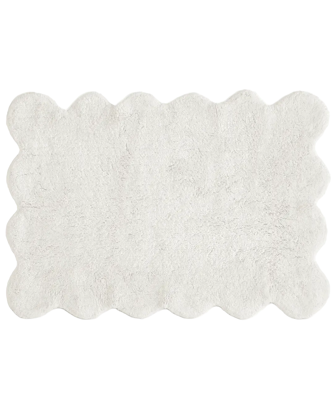 Badrumsmatta Clam vit i mjuk bomull med böljande mjuk form.
