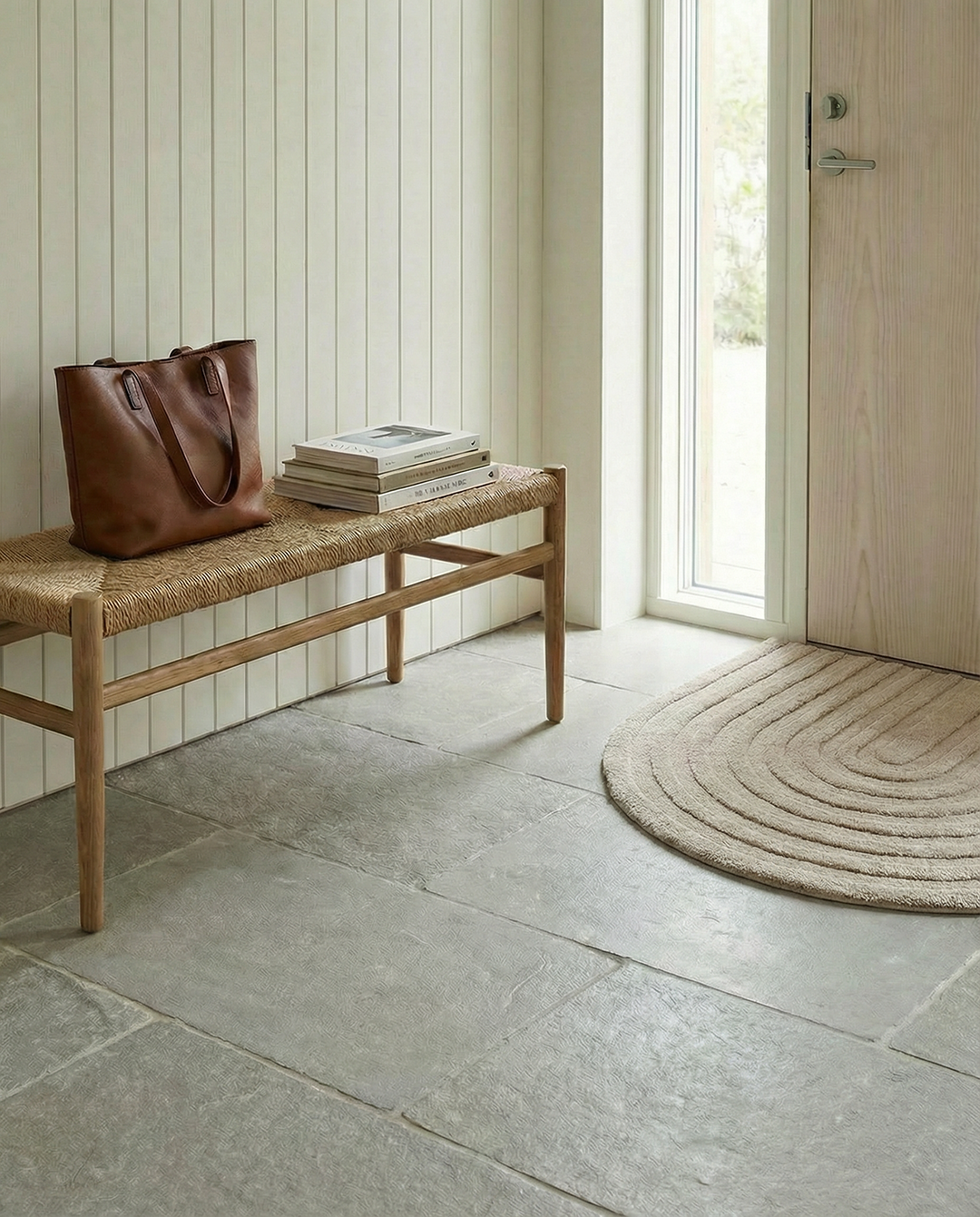 Arch är en beige dörrmatta i ull med mjukt bågformad silhuett och handklippt mönster. Den ljusa beige tonen ser bra ut tillsammans med trä, kalksten, grått kakel och andra naturmaterial, vilket gör att mattan passar i både moderna och mer klassiska hallar.