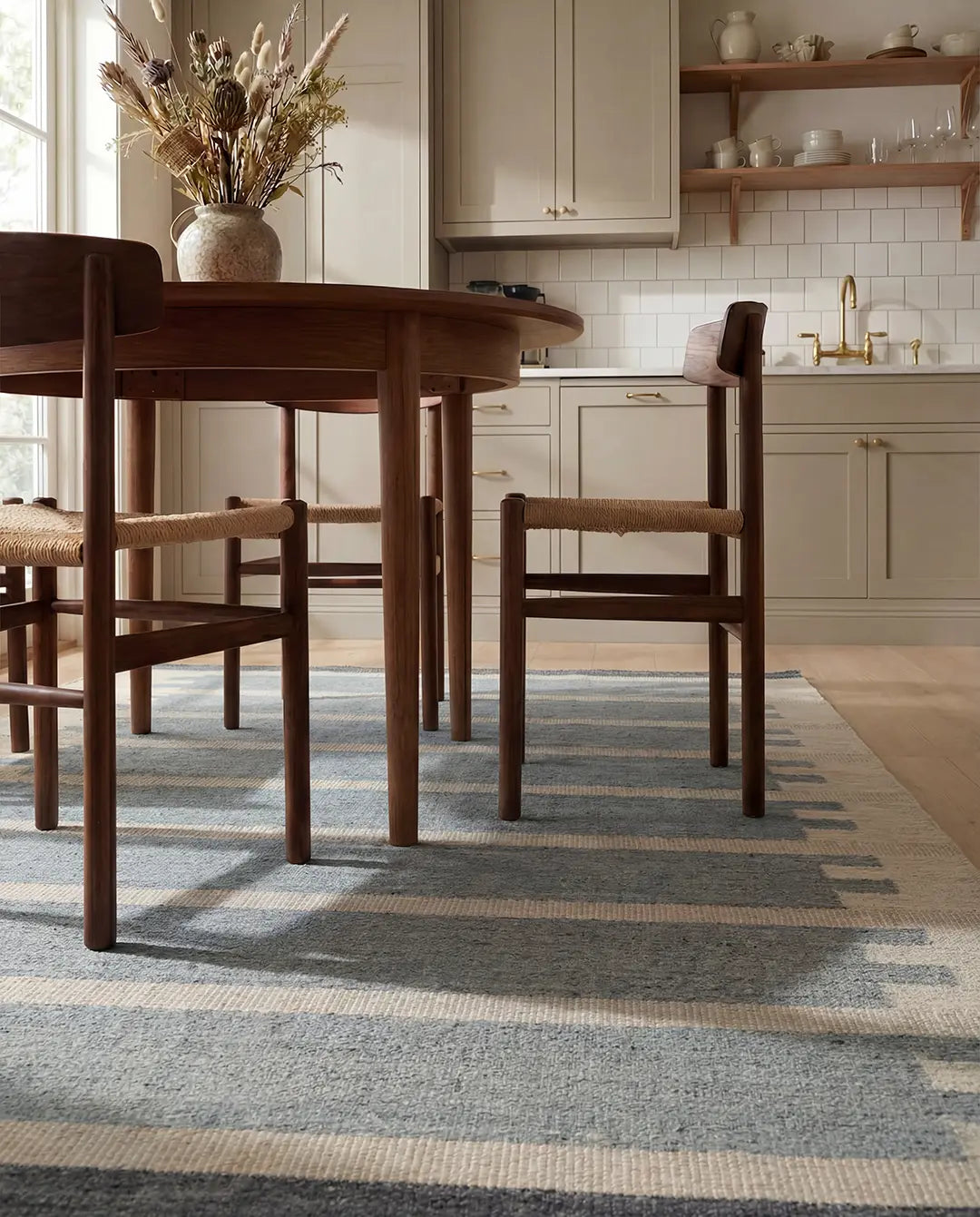 Den flatvävda konstruktionen gör mattan vändbar och lätt att placera i olika miljöer. Ytan är jämn men levande, där variationer i garn och väv framhäver det hantverksmässiga uttrycket. Ullen bidrar med slitstyrka och naturligt smutsavvisande egenskaper, samtidigt som den ger en mjuk och behaglig känsla.