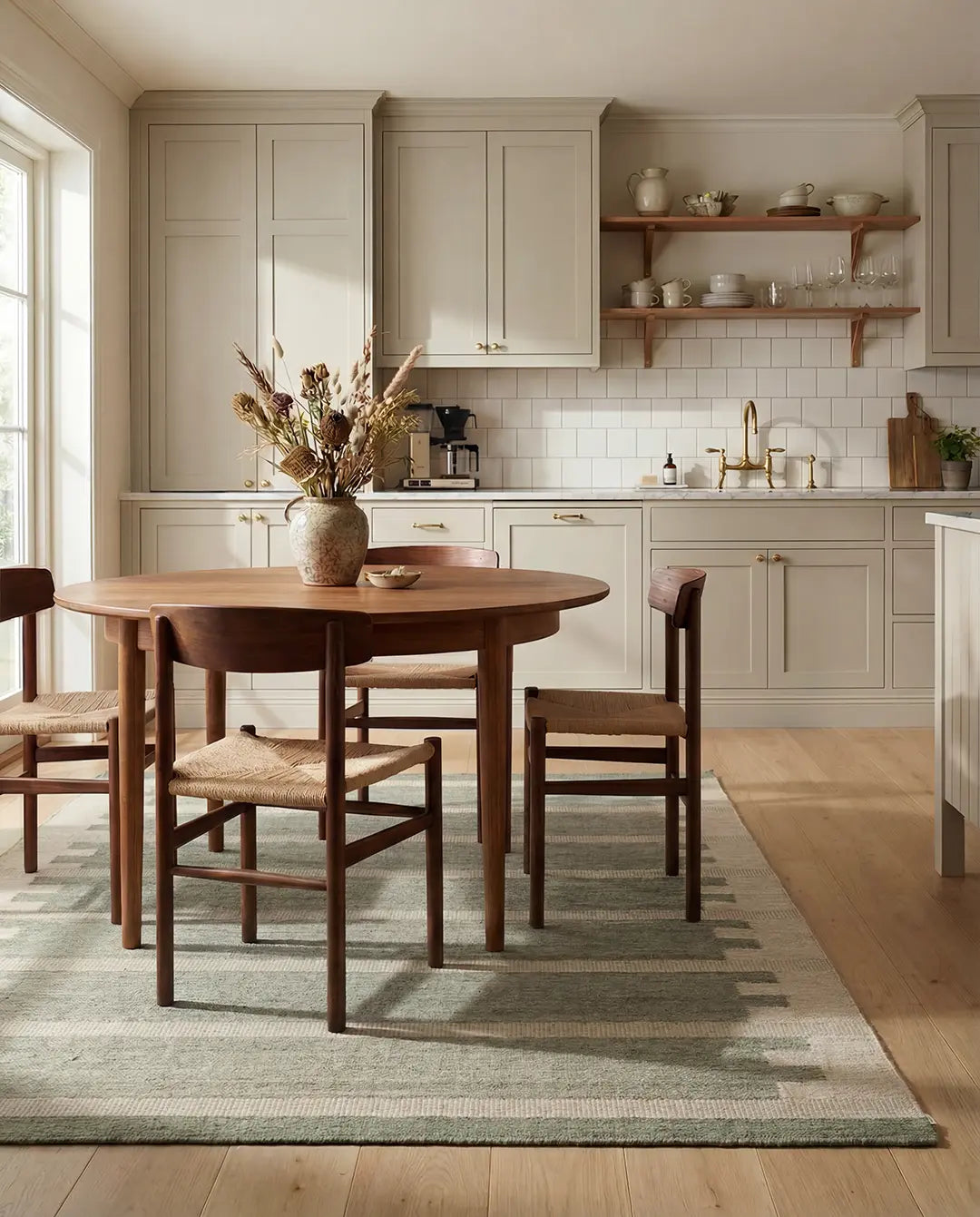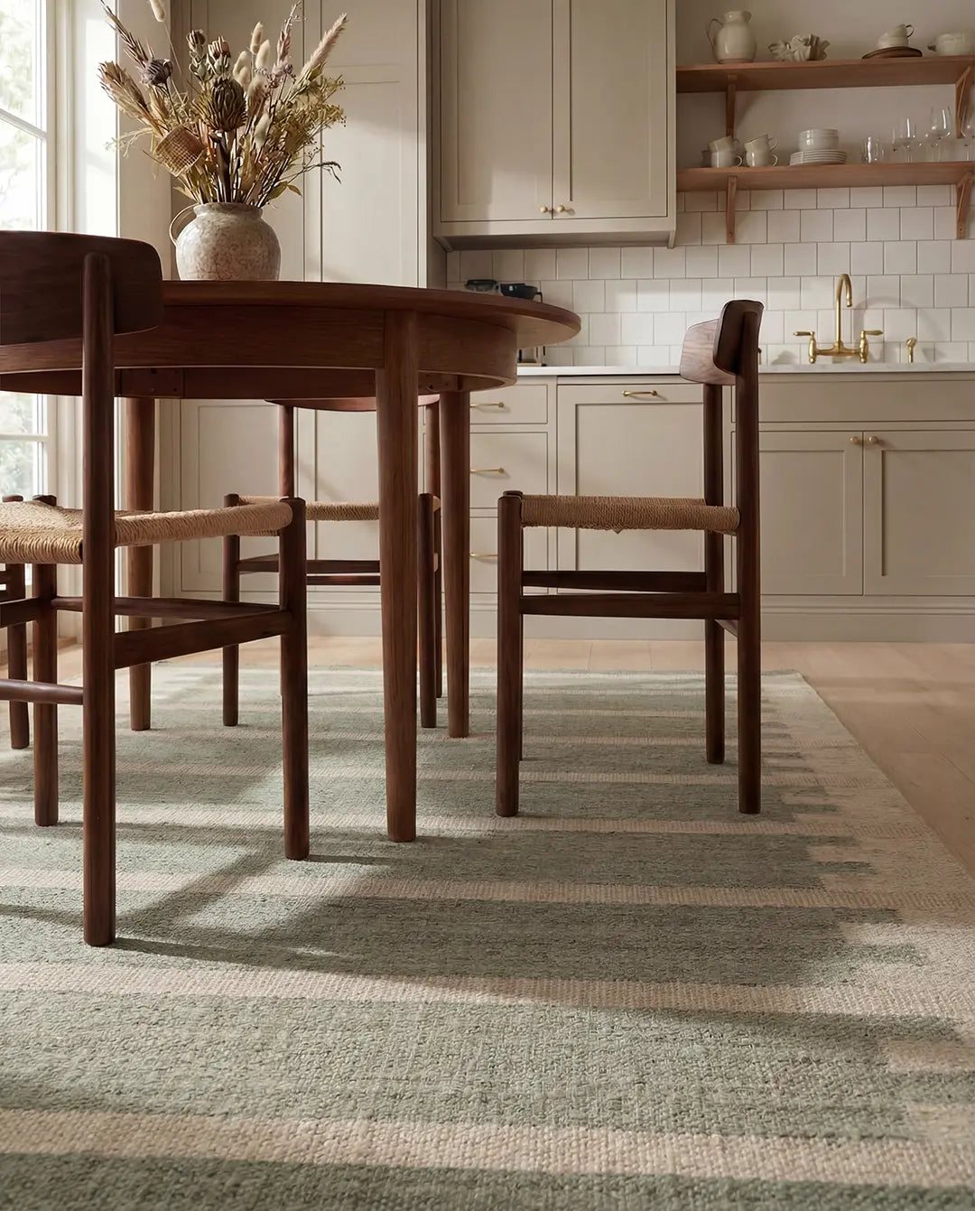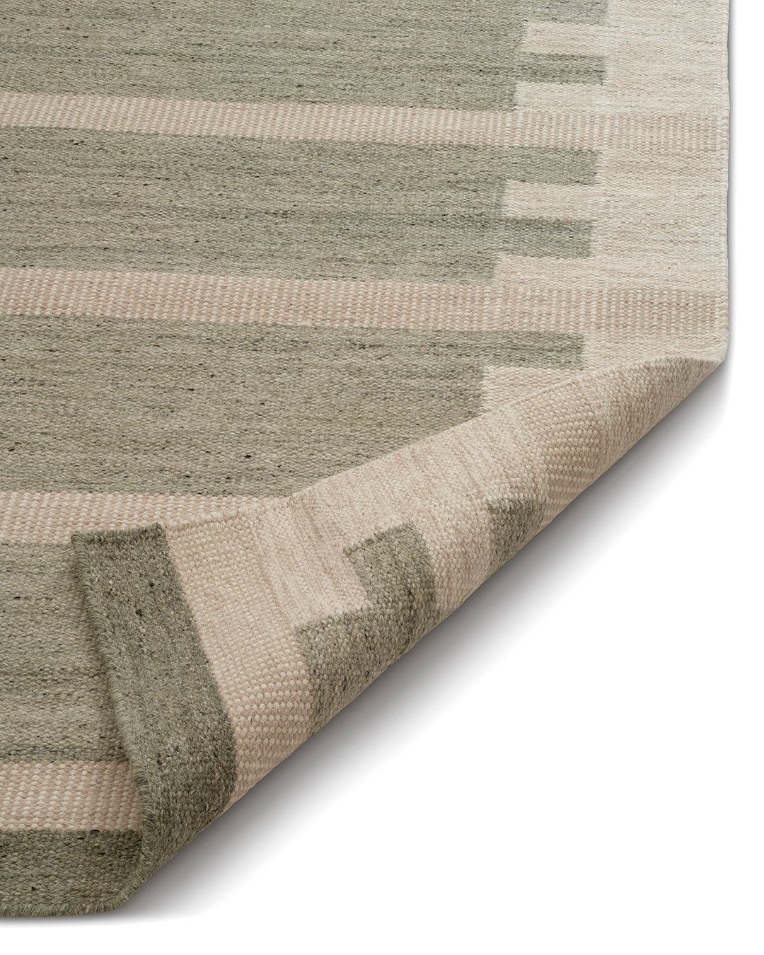 Den flatvävda konstruktionen gör mattan vändbar och lätt att placera i olika miljöer. Ytan är jämn men levande, där variationer i garn och väv framhäver det hantverksmässiga uttrycket. Ullen bidrar med slitstyrka och naturligt smutsavvisande egenskaper, samtidigt som den ger en mjuk och behaglig känsla.