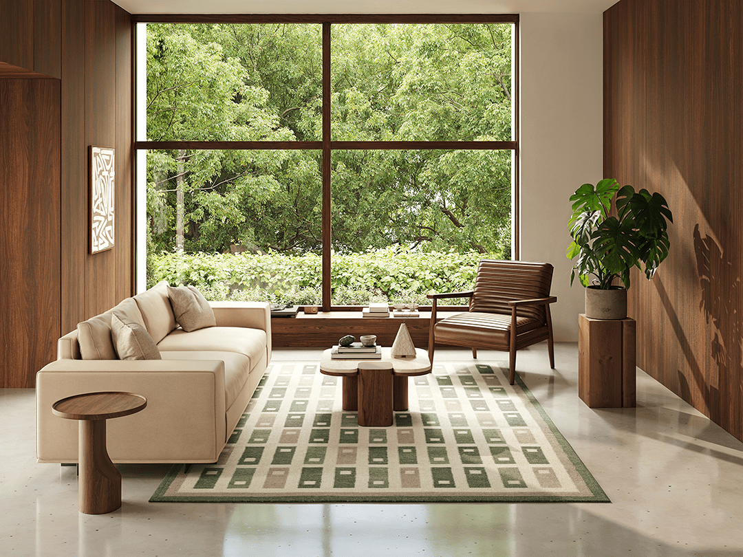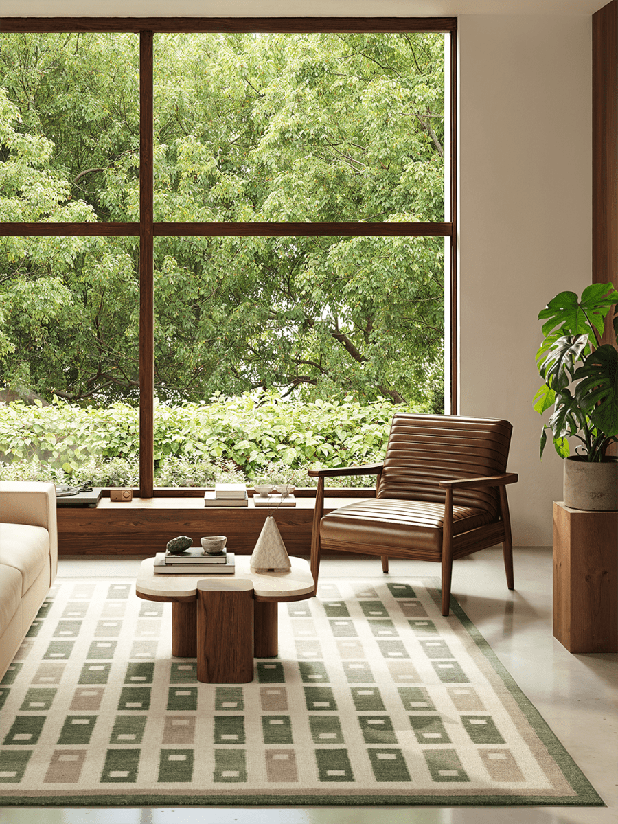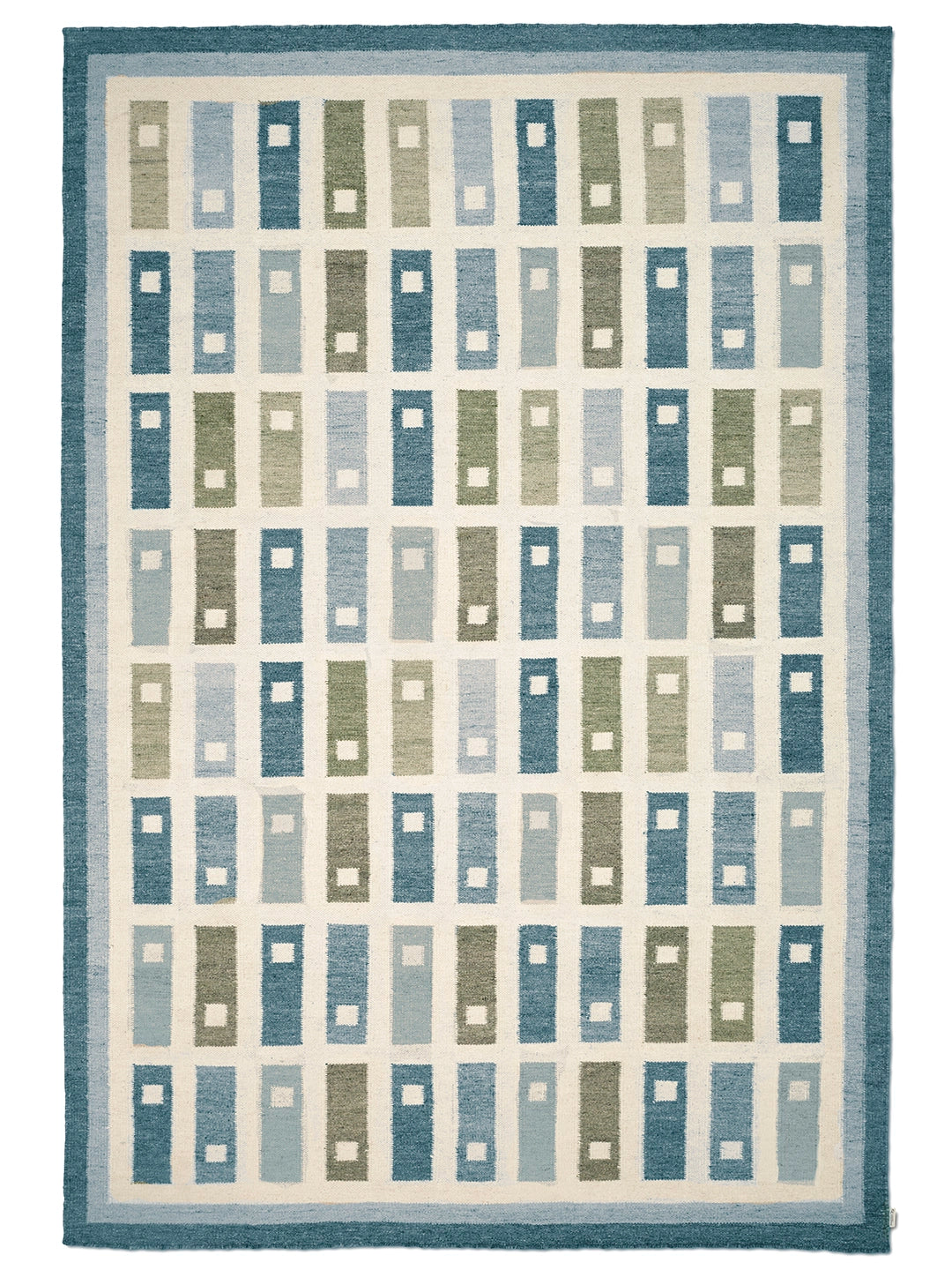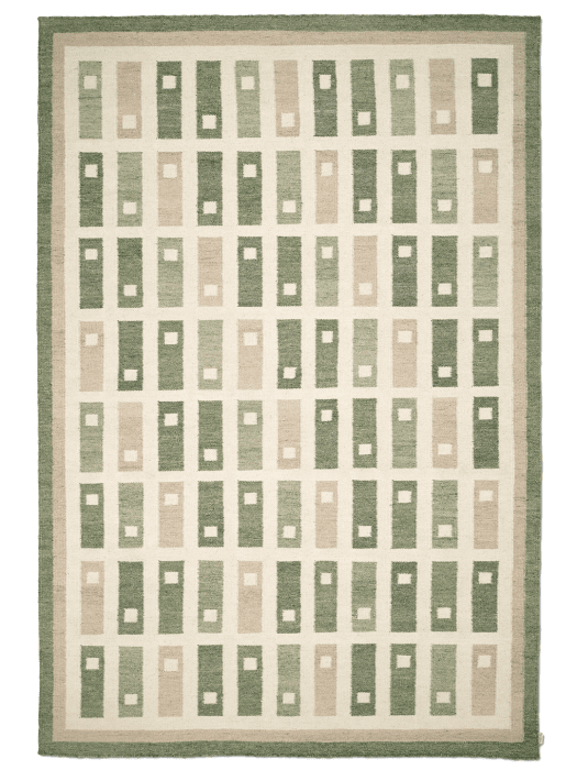 Fyrbo är en handvävd röllakanmatta i kollektionen Arv. Det återkommande blockmönstret, inspirerat av traditionell svensk textil, skapar ett tydligt grafiskt uttryck medan dämpade toner av skogsgrönt, salvia och sand ger en lugn helhet. Den flatvävda konstruktionen gör mattan vändbar, lättplacerad och smidig under möbler. Ullen är naturligt slitstark och smutsavvisande och får en vackert matt yta som åldras med behag. Mindre variationer i väv och nyans vittnar om det genuina hantverket.
