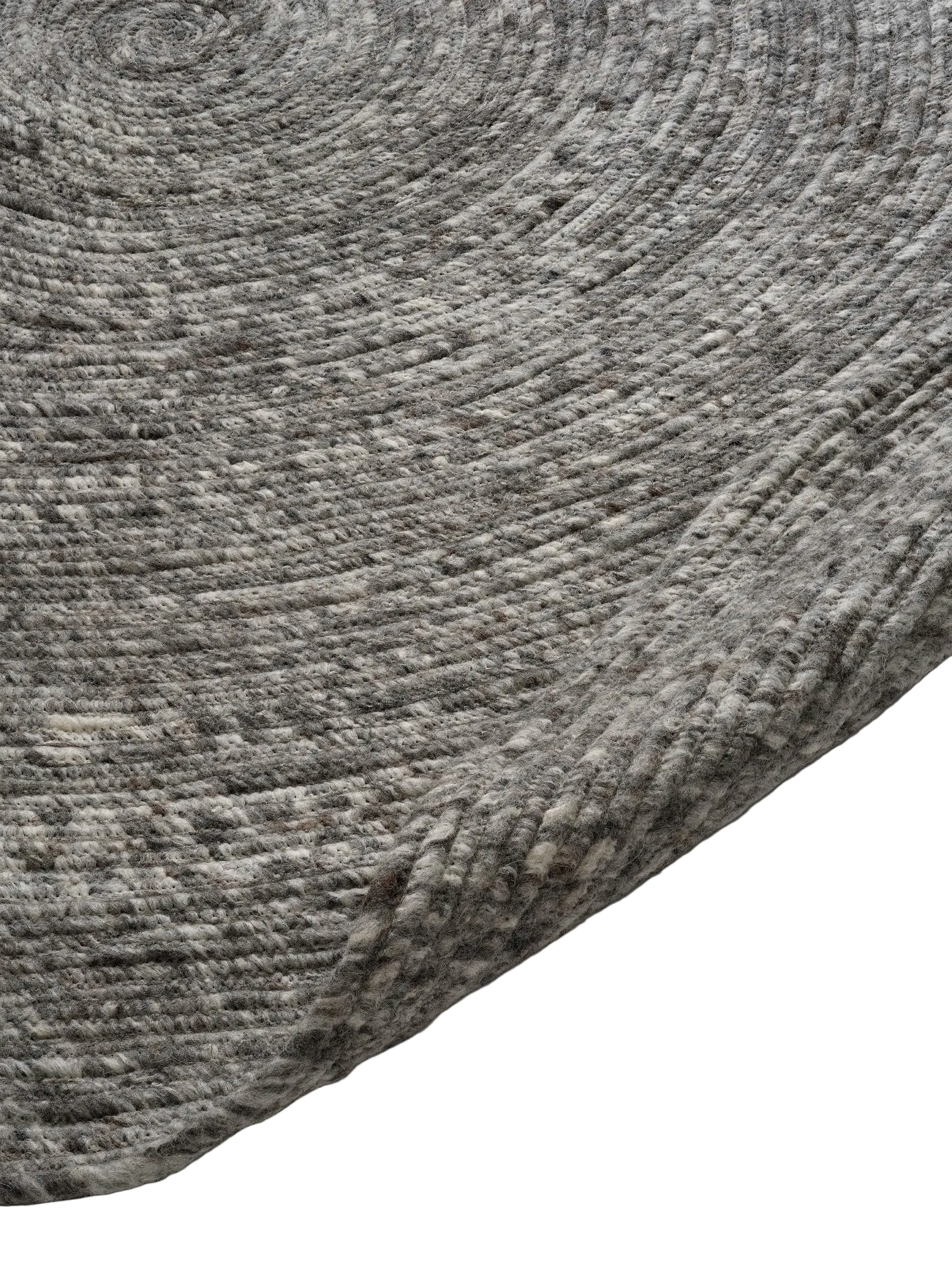 Ullen tvinnas omsorgsfullt runt en bomullsvarp för att skapa ett fylligt och slitstarkt garn. Garnet formas sedan till en elegant spiral, där varje varv sys samman med transparent tråd för att säkerställa både hållbarhet och en sömlös estetik.