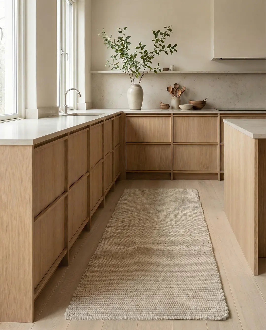Gångmatta Merino är en handvävd ullmatta med en mjuk och behaglig textur som påminner om merinoull. Den är tillverkad av en noggrant balanserad blandning av 85 % nyzeeländsk ull och 15 % europeisk ull, vilket ger en naturligt slitstark och smutsavvisande yta. Mattan är vändbar, vilket förlänger dess livslängd och gör den till en flexibel inredningsdetalj. Med sin tidlösa design och naturliga färgton blir den en elegant bas i alla rum.