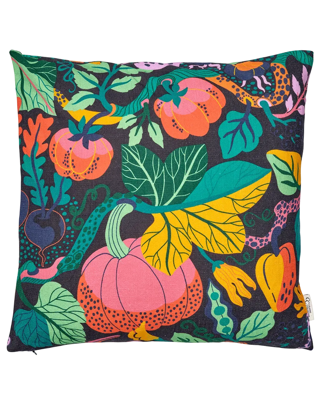 Kuddfodralet Heritage Garden Svart är en färgstark hyllning till trädgårdens överflöd. Det livfulla mönstret med frukter, blommor och bladverk framträder mot en djup svart botten som lyfter varje färgton – från solgult och korall till klargrönt och cerise. Motivet är tryckt på en kraftig bomulls- och linneblandning som ger struktur och djup åt det illustrativa uttrycket. Heritage Garden kombinerar lekfull design med gediget hantverk och blir en färgklick i såväl soffan som sängen.