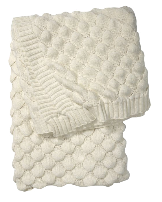 Pläd Gems Vit är stickad i mjuk bomull, har ett fiskfjällsmönster och en lätt melerad yta.
